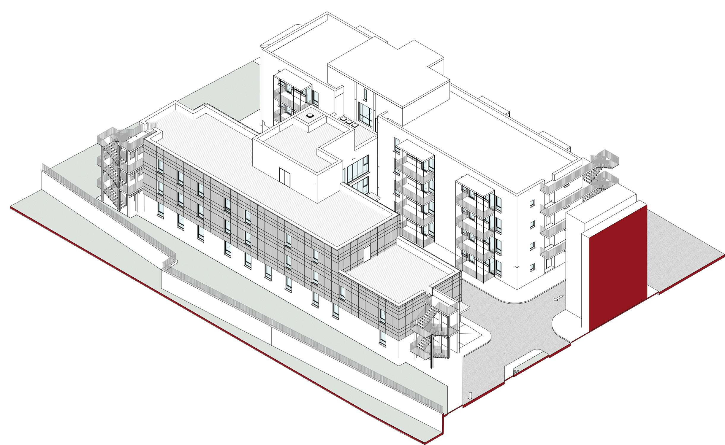 Lo sviluppo volumetrico e di facciata del nuovo edificio richiama i padiglioni esistenti, al fine di inserirsi in modo armonico all’interno dell’area socio sanitaria che si colloca nella zona paesaggistica del Castello di Torrechiara e del Torrente Parma.